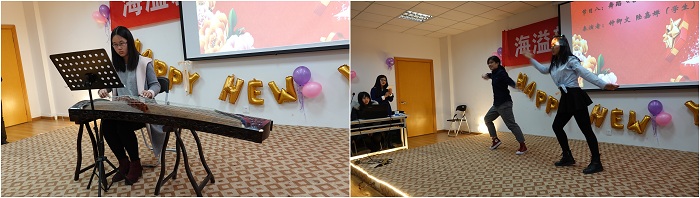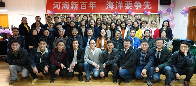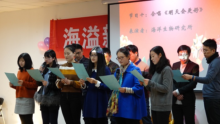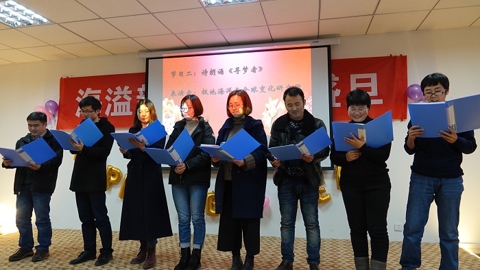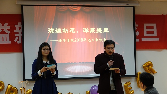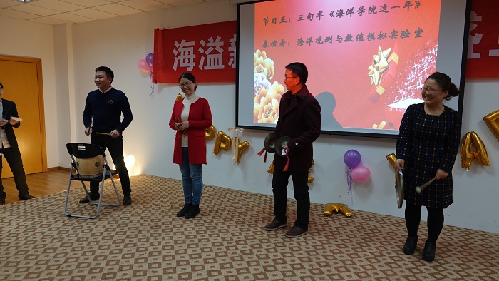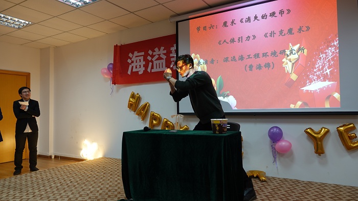 接下来的联欢会中,老师们各展所长,把现场气氛不断推向高潮。海洋观测与数值模拟实验室老师们的一曲合唱《相亲相爱一家人》和三句半《国产偷拍 这一年》,既让我们感受到温馨的大家庭氛围,还让我们体会了对学院建设的真情洋溢;极地海洋与全球变化研究所的诗朗诵《寻梦者》、院办的诗朗诵《海之子》和海洋地质研究所的合唱《勘探队之歌》,道出了我们追寻海洋梦的澎湃心声;金兴坤、鲍威、王书昆、张帅等四位老师的歌曲串烧,点燃老师们年轻萌动的热火;深远海工程环境研究所曹海锦老师的魔术表演《消失的硬币》《人体引力》《扑克魔术》,带领我们进入神奇的魔术世界;海洋生物研究所的合唱《明天会更好》,更让我们斗志昂扬,带着期许走向明天。学生表演了助兴节目古筝独奏《女儿情》与舞蹈《告白气球》,尽显学生的青春活力和多才多艺。