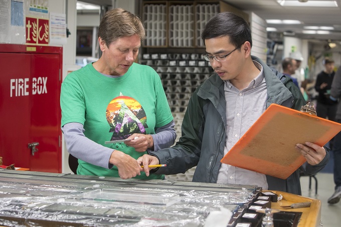 图3 与Rice University地质学家Julia Morgan讨论岩心构造问题(摄像: Tim Fulton, IODP JRSO)
