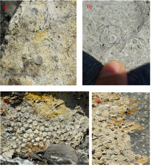 2、采集的化石标本。A)栖霞组灰岩中海百合茎横切面;B)栖霞组灰岩中螺类化石;CD)金陵组灰岩中珊瑚骨架化石。
