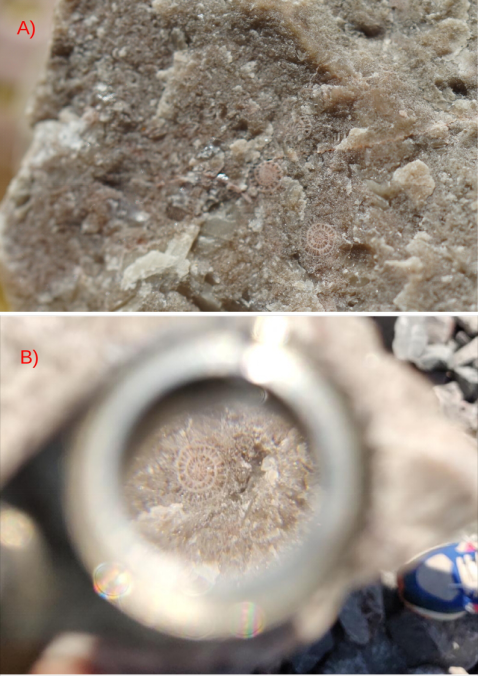 3、船山组灰岩䗴类化石。A)手标本;B20倍放大镜。