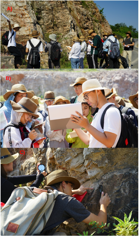 4、野外教学A)、B)。C)练习罗盘测量地层产状。