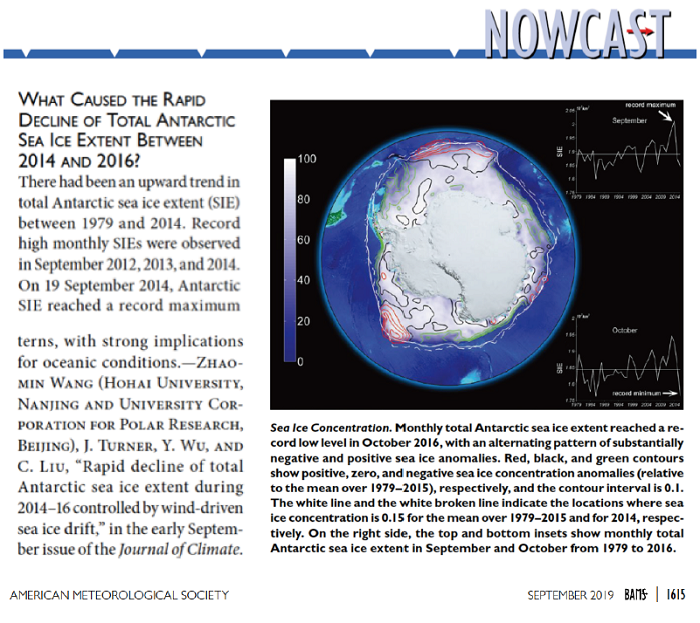 2019年9月出版的美国气象学会会刊(Bulletin of the American Meteorological Society,BAMS)在Papers of Note部分介绍了国产偷拍 一项研究成果。南极海冰月平均范围于2014年9月达到有卫星观测以来最高,随后以前所未有的速度减退,2016年10月达到创纪录低值。王召民教授团队与英国南极局John Tuner教授合作,研究了近几年南极海冰快速减退的成因。研究成果于今年9月在Journal of Climate正式发表(文章链接://journals.ametsoc.org/doi/full/10.1175/JCLI-D-18-0635.1)。
