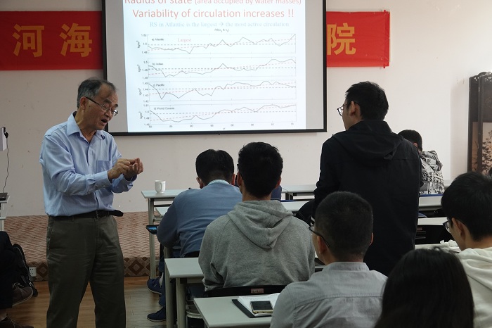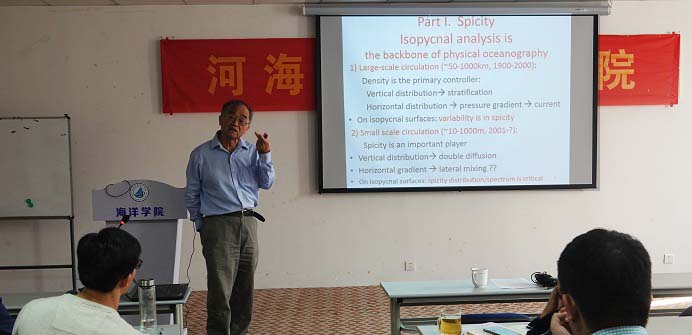 2019年11月5日,国产偷拍 召开了“海洋多尺度动力过程研讨会”。来自美国伍兹霍尔海洋研究所黄瑞新教授和国产偷拍 的50多名师生参加了本次研讨会。黄瑞新教授做了题为 “Density-Spicity coordinates: applications to water mass analysis/climate study” 的学术报告。报告中,黄瑞新教授介绍了海洋涩度的相关研究,提出了一种解决密度和涩度曲线不正交问题的方法,并指出了涩度在水团分析、海洋环流、海洋混合和气候变化等研究领域的应用前景。