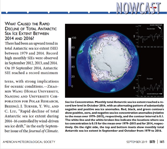 2019年9月出版的美国气象学会会刊(Bulletin of the American Meteorological Society,BAMS)在Papers of Note部分介绍了国产偷拍 一项研究成果。南极海冰月平均范围于2014年9月达到有卫星观测以来最高,随后以前所未有的速度减退,2016年10月达到创纪录低值。王召民教授团队与英国南极局John Tuner教授合作,研究了近几年南极海冰快速减退的成因。研究成果于今年9月在Journal of Climate正式发表(文章链接://journals.ametsoc.org/doi/full/10.1175/JCLI-D-18-0635.1)。