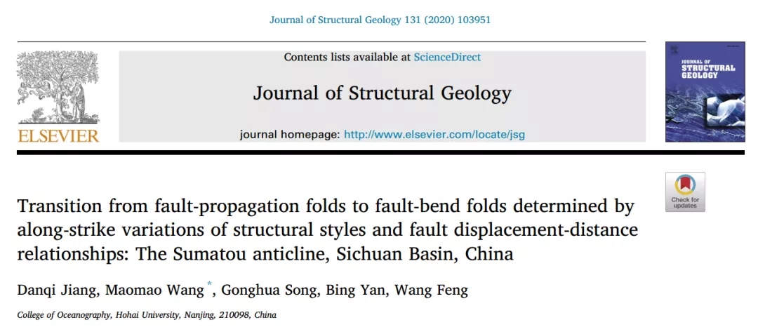 针对这一现象,蒋丹琦等人对三种可能的变形机制转变模型进行了正演数值模拟,并结合实际解释数据得到苏码头背斜构造在横向发育的过程中由早期的断层传播褶皱向断层转折褶皱转变。值得注意的是,褶皱构造变形机制沿走向变化的现象在四川盆地、日本南海海槽和非洲西海岸尼日尔三角洲等其他自然界构造实例中也有出现。通过对这些自然界实例的进一步分析,蒋丹琦等人认为苏码头背斜变形机制沿走向的变化可能是因为该构造不同段处于不同的褶皱变形发育阶段。该研究结果表明在分析挤压逆冲褶皱构造的三维演化机制时,不仅要分析构造变形的几何学特征,还需要确定断层的位移—距离关系,以便更准确地了解褶皱的时空演化机制。