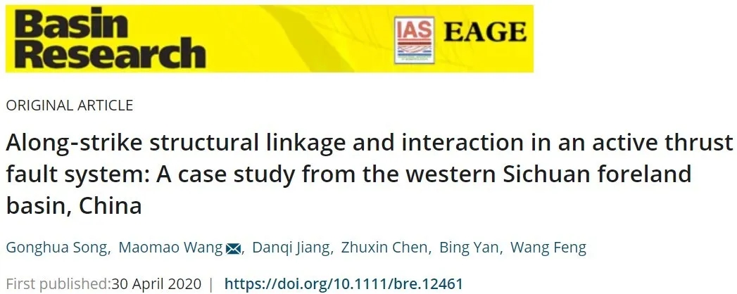 近日,同一课题组的2017级硕士研究生宋功化基于川西前陆盆地的高精度三维地震反射数据,系统地描述了复杂的逆冲构造系统的横向发育和连接过程,构建了构造横向发育和连接的几何学与运动学过程,相关成果发表在《Basin Research》上。《Basin Research》是沉积学和盆地研究领域的权威期刊,也是国际沉积学家协会和欧洲地球科学和工程师协会的会刊。2019年IF=3.542,中科院分区2区。