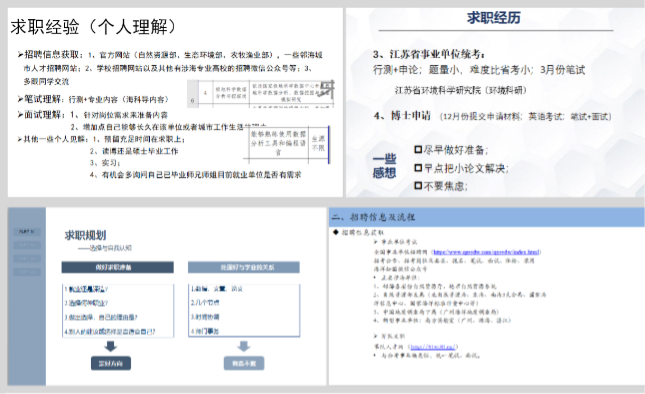接下来,五位优秀毕业生代表分别根据自己的实际经历展开了详细的分享。目前就职于中华人民共和国教育部的杨纯懿学长从求职规划、备考技巧、求职心态、避坑经验等四个方面进行讲解,叮嘱同学们要根据自身情况进行职业道路选择,并始终保持乐观心态。就职于国家海洋局南海调查技术中心的陈栋学长,着重为大家介绍了获取招聘信息的途径以及在求职中的注意事项。成功签约到中国极地研究中心的张浩然学长重点讲解了面试技巧,他提醒面试不仅要针对岗位准备内容,还要向工作单位展现想要留下的强烈意愿。李兰满学姐目前就职于江苏省海涂研究中心,她主要介绍了事业单位考试的流程及时间节点,并以自身经历劝诫学弟学妹尽早做好就业准备,早日完成学习任务,从容应对焦虑心态。已上岸江苏选调生的王煊学姐从选调生定义、选调流程、备考经验三个环节展开叙述,使得同学们对选调生有了进一步的了解。