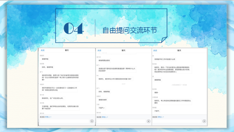 在最后的提问交流环节中,同学们纷纷在互动区提出问题,并得到了学长学姐们的耐心解答。本次分享会持续了约两个半小时,学长学姐们的倾囊相授使得同学们对未来的职业方向有了更加明确的规划,了解了就业应具备的专业素质与应聘技巧。
