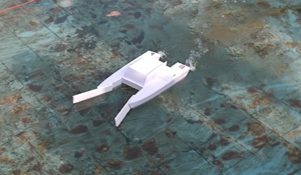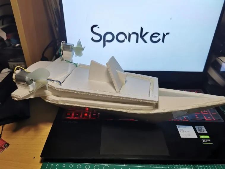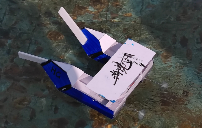 设计理念:侧舷安装覆盖型2mm附甲板,两侧推进核心部分安装有推进轴稳定器,推进桨叶继承司南号的半入水思想,桨叶1/5浸水。主要材料包括2mm雪弗板,热熔胶,焊枪及焊丝,主办方提供的遥感及动力系统。强化两翼使其可以搭载更多的设备,采用整铸式外舱结构,以增强结构连贯性,底部增加龙骨,以增强船底抗打击能力。