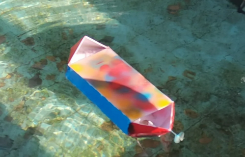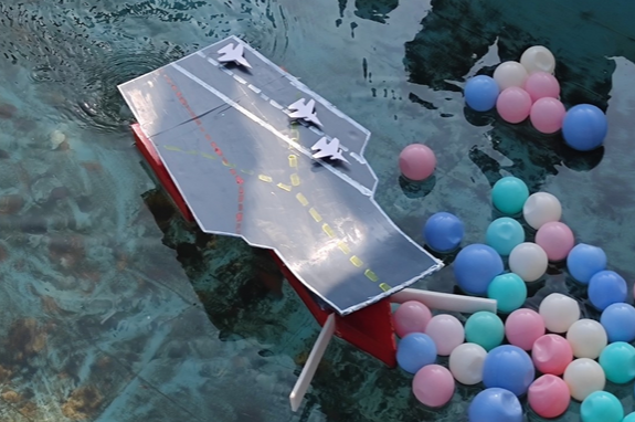 设计理念:本船整体采用单体流线型结构,以船速快、稳定性高、核载量大为主要目的,初赛直道竞速的结果也能证明该结构有一定优越性。船头部大体呈三方单锥形,前尖后平。底部由四张板拼接而成,呈尖角状。内部仓板上侧装有电路板和发动装置,后部装有螺旋桨外套。外部船体颜色以红黄蓝为主色,灵感来源于三原色及三色鱼。