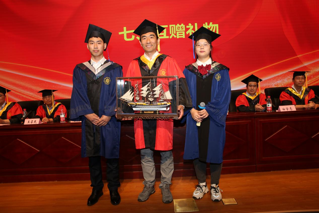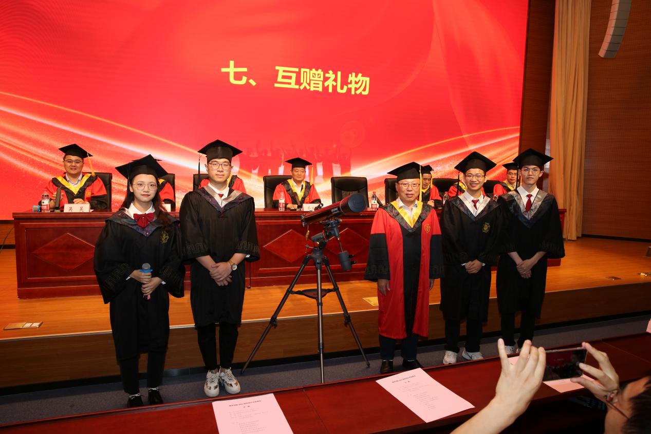 齐义泉为毕业生代表赠送学院精心定制的戒指并致以真挚的祝福,让祝愿与期盼一直陪伴毕业生走向未来征途,研究生代表向学院赠送一艘韦斯普奇号高桅横帆船模,寓意一帆风顺,扬帆远航,表达对国产偷拍 及国产偷拍 的美好祝福。本科生代表向学院赠送一架可以自动寻找星体方位的特朗90DX天文望远镜,并祝愿学院蒸蒸日上,目之所及有璀璨星辰,心之所往为浩瀚大海。互赠礼物后,学院领导代表与学生代表合影留念并互道感谢与离别。