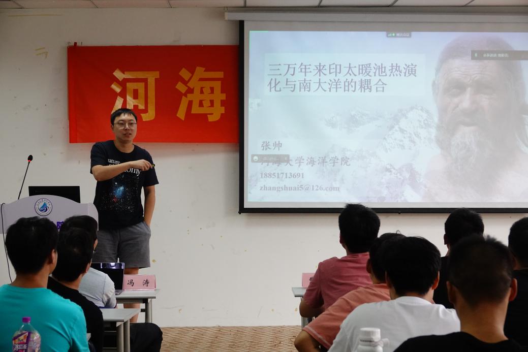 张帅老师将海洋地质与古气候变化相结合,分享了《三万年来印太暖池热演化与南大洋的耦合》的报告。此研究以全球冰期-渐冰期的变化为核心,引用诸多科学家的历史小故事,讲解了科学家们对冰川运动、多次冰期、冰期旋回的认识过程。报告指出,冰期变化在于偏心率、地斜倾斜度、分点进动、风化等原因,并根据相关假说——米兰科维奇假说指出冰期形成在于“凉夏”、热带驱动假说指出北大西洋是冰期的“开关”热带太平洋是“引擎”、西兰洲假说以及海表温度计算、浮游有孔虫、Mg/Ca变化尺度等有力证据,证明地球正处于冰期到渐冰期的变化阶段。