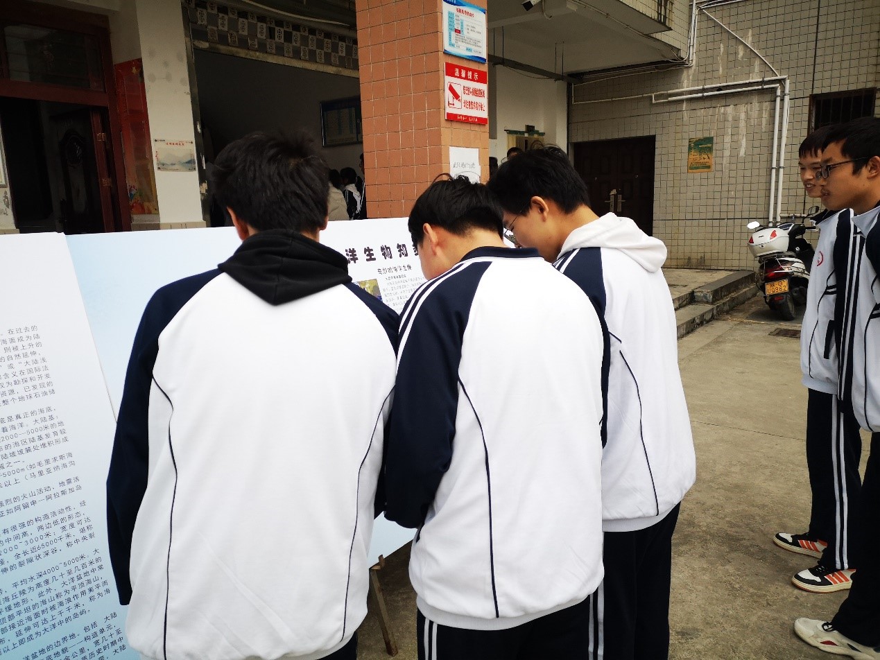 科普展共分为“迈进海洋”——岩石的地质经历展、 “跃动海洋”——海洋生物科普展、“走进蔚蓝”——海洋与气候、 “探索海洋”——海洋观测技术展4个展区,让海洋知识融入校园文化建设中,提高了学生们的科学素养,增强海洋意识,营造了良好的科普知识宣传氛围。