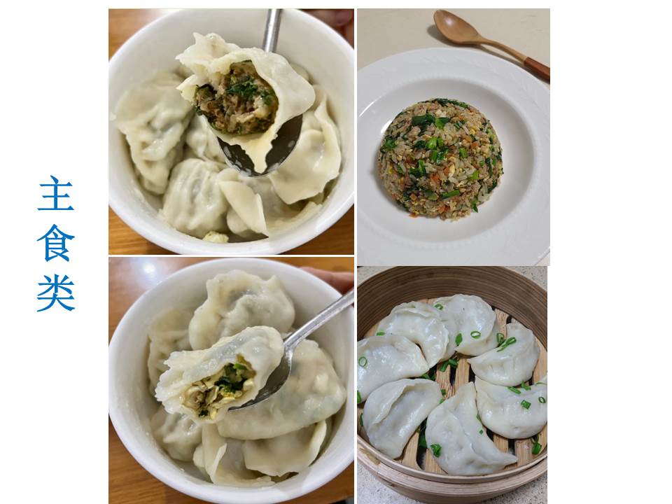 主食类:荠菜水饺(刘彩英)、菜苔炒饭(徐晓华)、荠菜鸡蛋水饺(刘彩英)、荠菜蒸饺(徐晓华)。