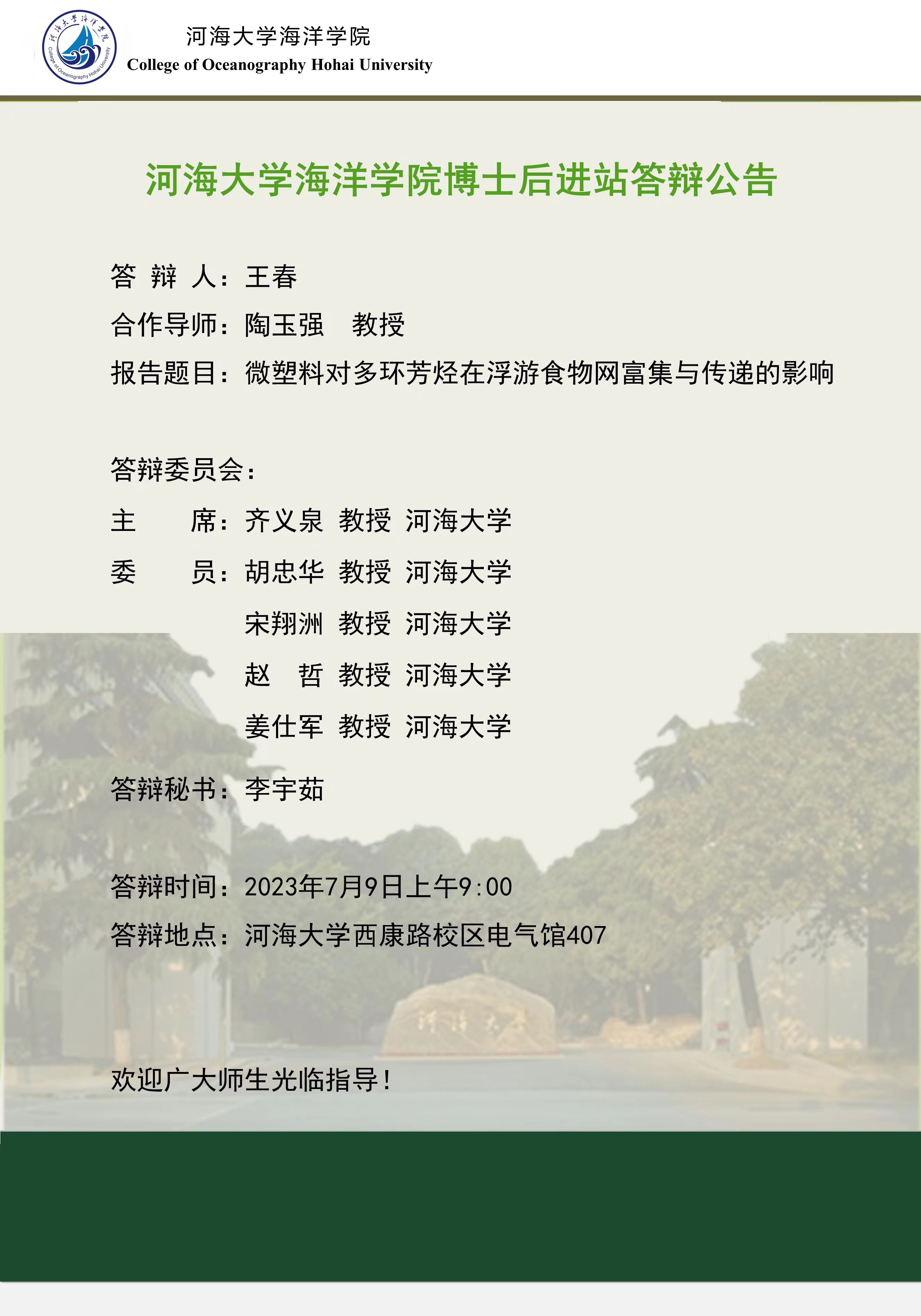 国产偷拍 博士后进站答辩公告(王春)