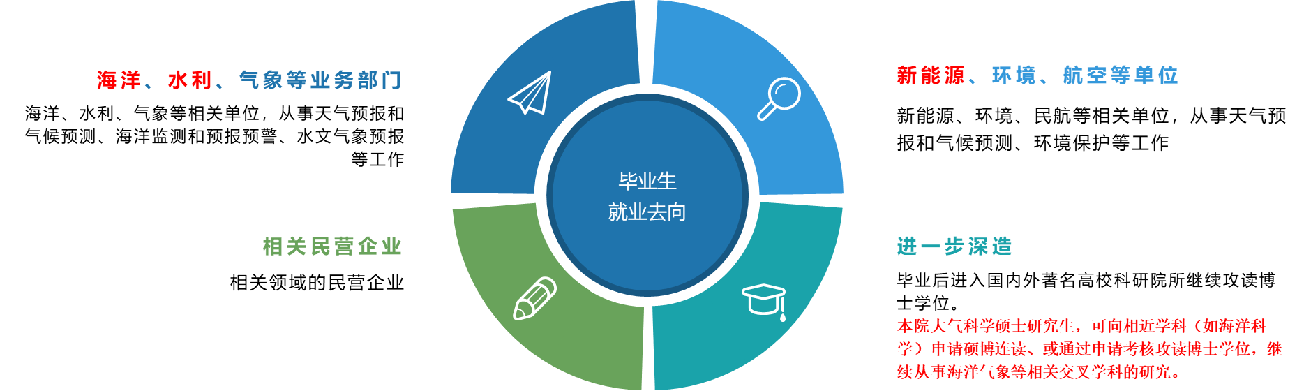 大气科学专业的毕业生可进入海洋、水利、气象等业务部分从事气象研究的相关工作,毕业生也可进入新能源、环境、航空等相关领域,从事与气象交叉的相关岗位。此外,按照国产偷拍 硕博连读政策,在硕士第一年或第二年,学生可申请相近学科的硕博连读,继续在海洋气象领域深造。