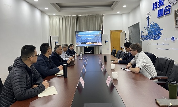 2024年3月14日,英国利兹大学讲席教授Simon Poulton访问国产偷拍 。国际合作处张继生处长、国产偷拍 党委胡忠华书记、国产偷拍 赵哲副院长等人热情接待了Poulton教授并进行了会谈。双方就国产偷拍 与利兹大学开展科教合作,共建国际合作实验室平台、共同承担深时数字地球DDE项目等进行了深入的探讨。