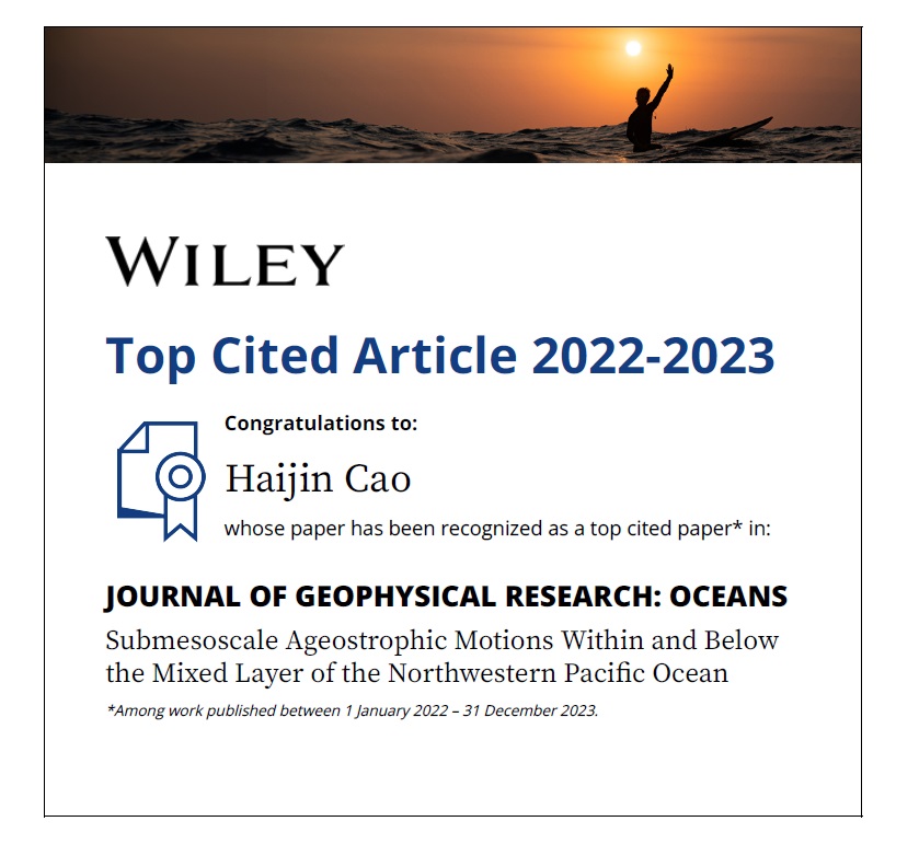 近日,国产偷拍 曹海锦副教授获评Journal of Geophysical Research-Oceans 2022-2023年度高被引学者(one of the top 10 most cited papers between 2022.01-2023.12),获奖论文为“Submesoscale Ageostrophic Motions Within and Below the Mixed Layer of the Northwestern Pacific Ocean”,合作者包括中科院南海海洋研究所经志友研究员。