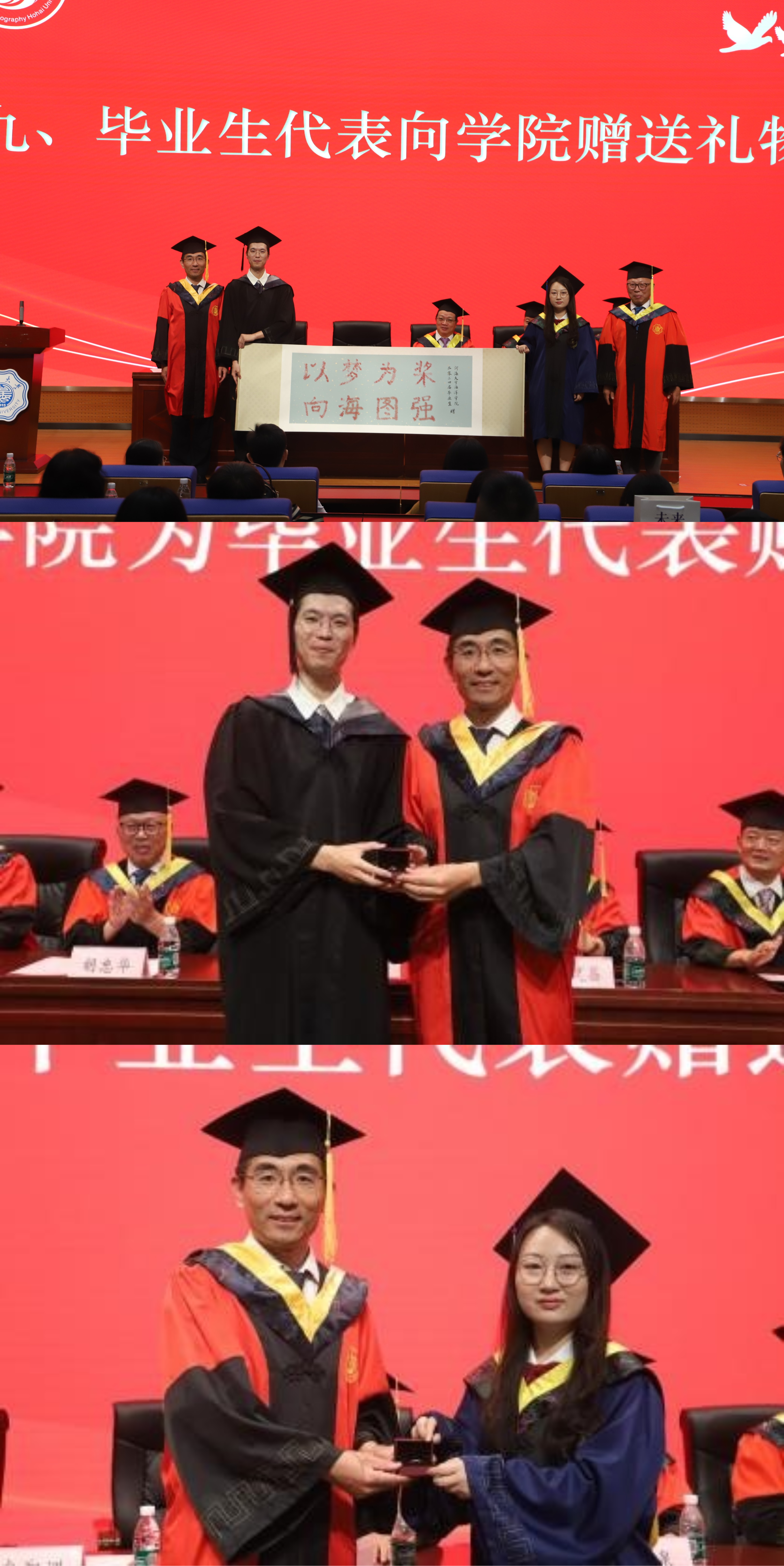 研究生与本科生代表向学院赠送了由全体毕业生亲自绘制的“以梦为桨,向海图强”指纹图画,寄托了毕业生们对学院的深深祝福,寓意毕业学子与学院永远心心相印,心系海洋,时刻谨记学院教诲,祝愿学院蓬勃发展,蒸蒸日上。院长宋翔洲为毕业生代表赠送学院精心定制的戒指并致以真挚的祝福,让祝愿与期盼一直陪伴毕业生走向未来征途,赠送礼物后,学院领导代表与学生代表合影留念并互道感谢与离别。
