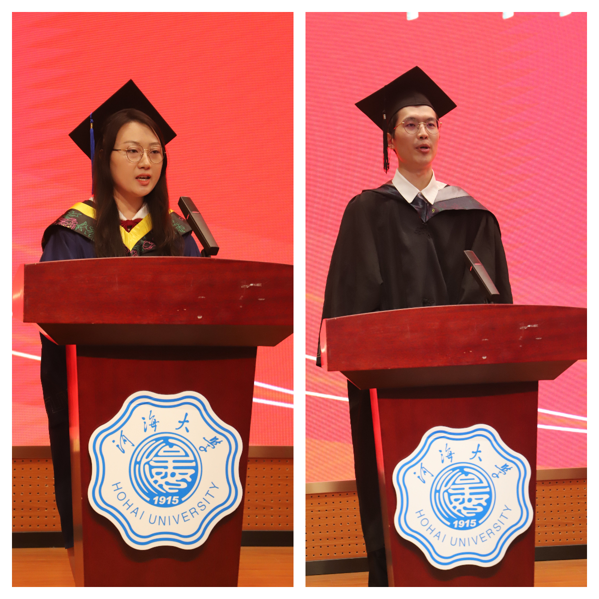 徐晶作为研究生毕业生代表表达了对校园的不舍、对师长的感激以及对母校的祝愿。她表示,在未来的日子里,毕业生们会牢记谆谆教诲,勇毅前行,以谦逊的态度、踏实的步伐,运用专业所学,为学院争光添彩。本科生毕业生代表国子孺表达了对老师们的感谢,并表示会在未来的人生道路上,谨记河海校训、承续先辈之志、展现河海风貌、勇担时代之责,践行对河海的承诺与保证,为中华民族伟大复兴出一份力。